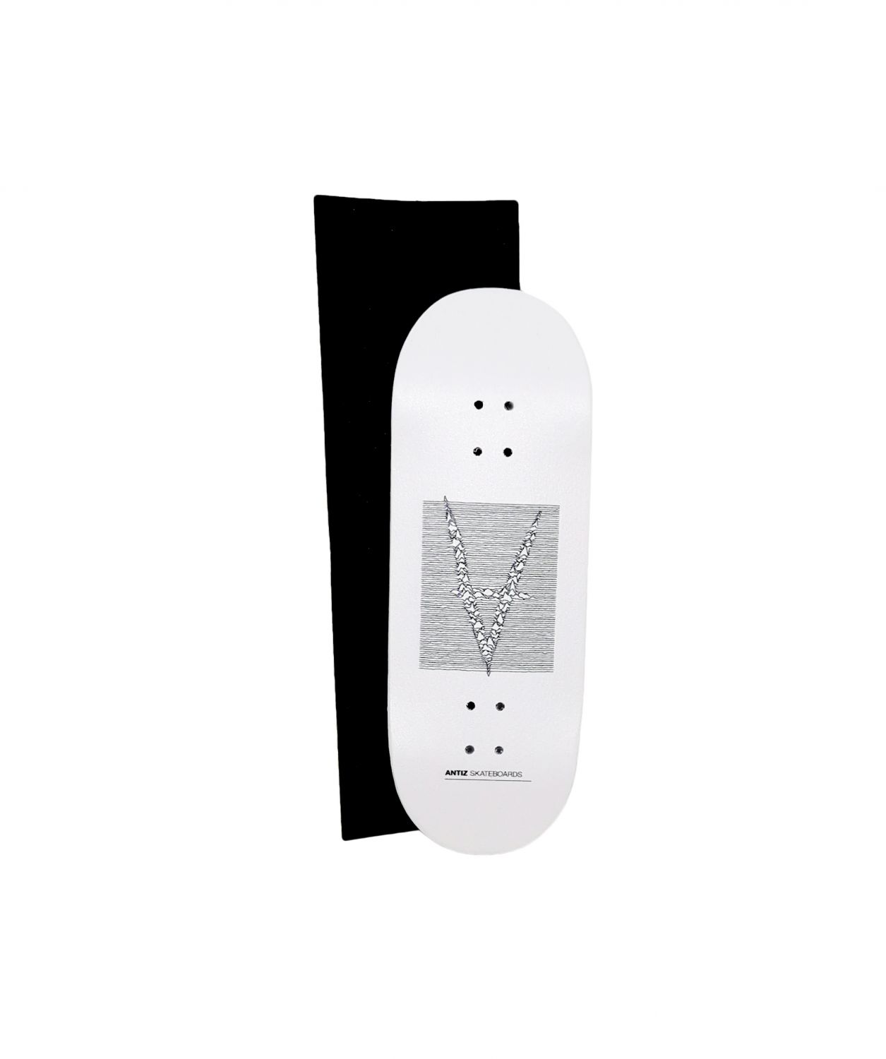 This complete wooden fingerboard set up includes a 5 maple plys 34 mm fingerboard deck, medium concave, with an original Antiz Skateboards graphic reminding a Joy Division music album cover, CNC white bearing printed wheels, printed trucks 34mm wide, tool and locking nuts, screws, silicon bushings and washers necessary to assemble it your own. A rectangle rip tape is also included under the deck, to position and cut as you like!